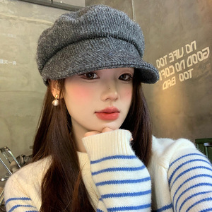 日系羊毛混纺平顶贝雷帽女秋冬季显脸小八角帽大头围保暖报童帽子