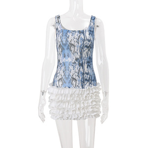 ins欧美风2025秋季新款纯欲甜辣U领亮片涂鸦撞色褶皱背心连衣裙女