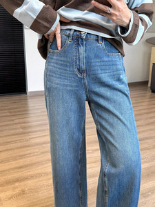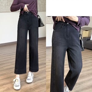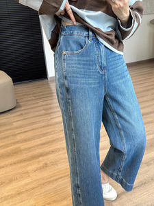 2025秋季日韩休闲高腰直筒九分牛仔裤 水洗牛仔宽裤中弹力工艺高