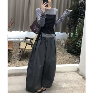韩系女时尚撞色拼接假两件长袖上衣2025春秋款系带收腰阔腿裤套装