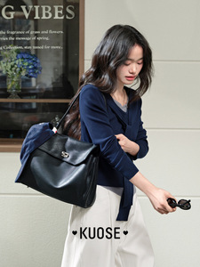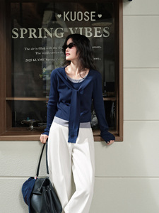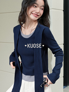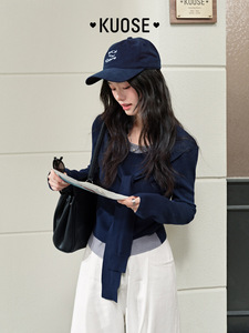 阔色藏蓝色假两件披肩针织衫女秋季新款设计感长袖毛衣上衣春