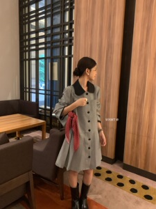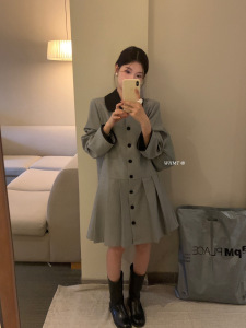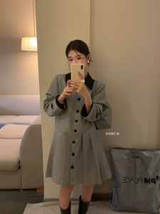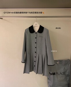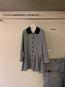 【WOW】miu系撞色翻领拼接千鸟格百褶连衣裙小个子收腰短款裙子