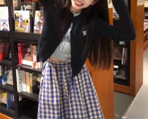 韩系氛围感穿搭藏青色假两件针织开衫女早秋季小个子短款上衣外套