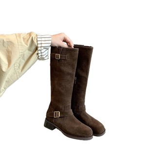 羊皮版~苏茵茵同款扣子靴~复古绒面扣带粗跟中高筒长靴女骑士靴