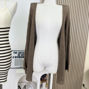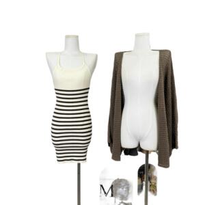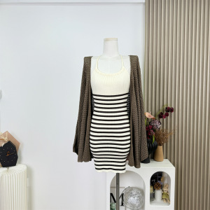 慵懒小猫挂脖撞色条纹针织连衣裙开衫套装