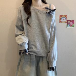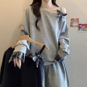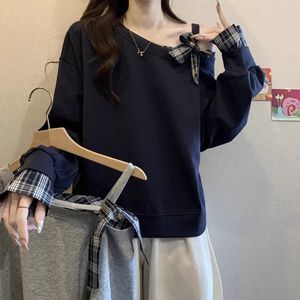 大码格子拼接一字肩斜肩卫衣女春秋新款宽松显瘦遮肉露肩长袖上衣