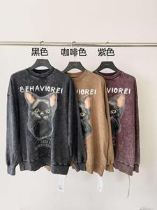 2025冬季水洗做旧猫咪印花上衣宽松圆领中长款时尚潮流卫衣85311