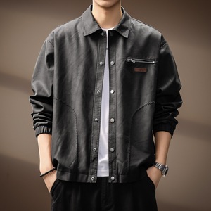美式复古翻领皮衣外套男士秋季新款潮牌硬汉工装阿美咔叽长袖上衣