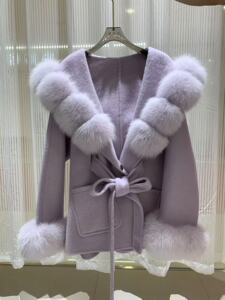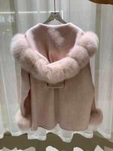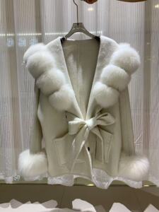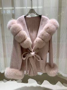 秋冬新款双面呢羊毛大衣女中长款狐狸毛连帽款糸腰带时尚洋气