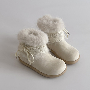 复古风纯色花边蝴蝶结加绒保暖雪地靴女秋冬季时尚平底圆头时装靴