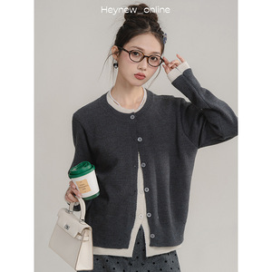 LOVEHEYNEW假两件撞色圆领纽扣针织开衫女2025春秋外搭显瘦上衣