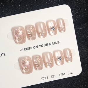 X471蝶羽鎏金烟花猫眼穿戴甲蝴蝶鎏金猫眼珍珠裸色手工封层美甲女