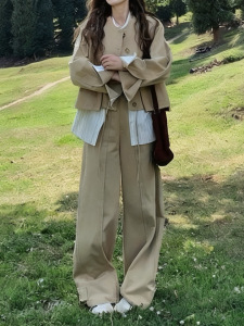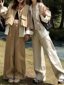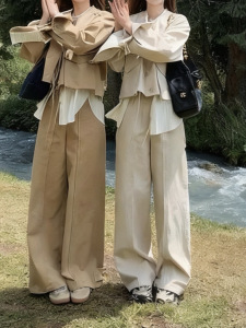 时髦艺术生/撞色假两件夹克外套+立体结构线阔腿裤