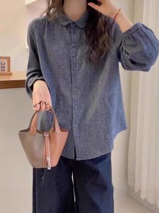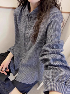 法式小格子长袖衬衫女春秋新款小个子复古灯笼袖翻领开衫衬衣上衣