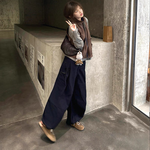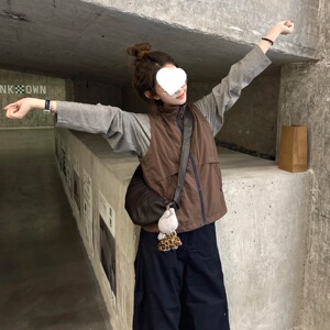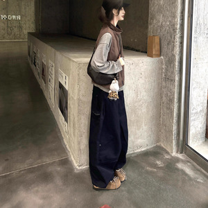 早秋搭配一整套美式复古咖色装马甲叠穿打底衫休闲阔腿裤三件套