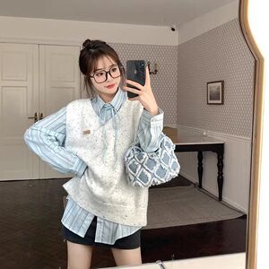 学院风针织马甲毛衣女减龄秋季背心长袖条纹衬衫宽松新款两件套装