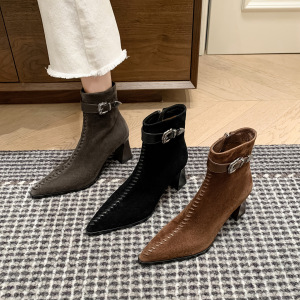 糯糯羊皮~编织7cm高跟短靴气质女人味优雅粗跟高级感咖色及踝靴女