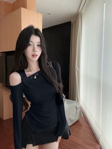 小众不规则设计感收腰修身长袖T恤女斜领露单肩打底衫辣妹上衣ins