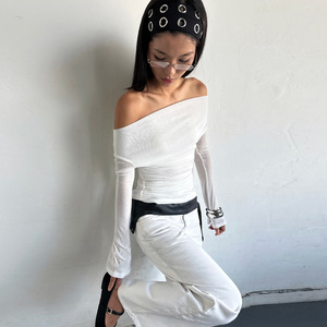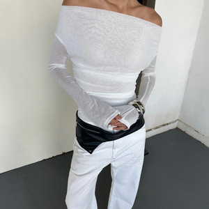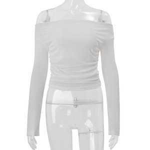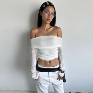 INS欧美风2025秋季新款纯欲甜美一字领褶皱修身显瘦长袖上衣T恤女