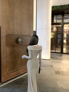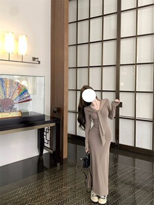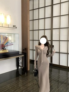 纯欲温柔气质拼接系带长袖针织连衣裙女早秋新款收腰显瘦长裙女装