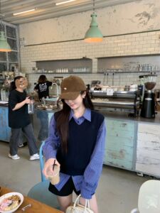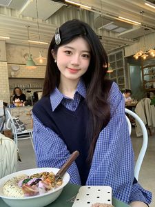 慵懒藏青色V领针织马甲背心女装早秋气质韩系叠穿格子衬衫两件套