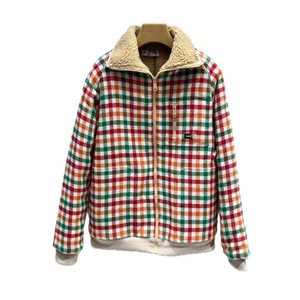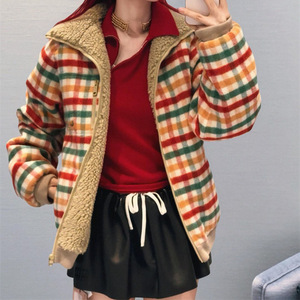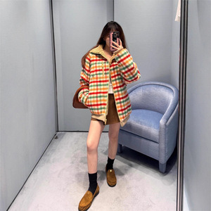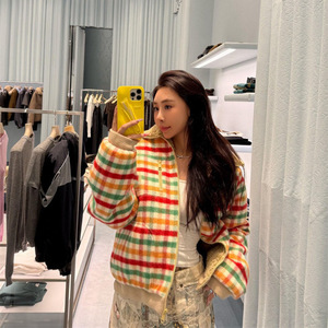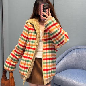 25秋季新款南油高定Miu简约休闲百搭彩色格纹羊羔毛领夹克外套