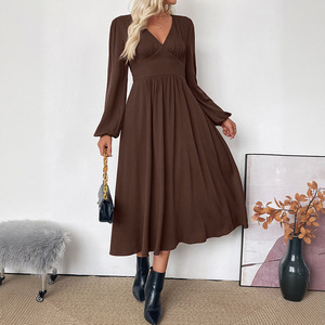 2025年tiktok秋季热卖欧美跨境外贸纯色V领高腰长袖棕色连衣裙女