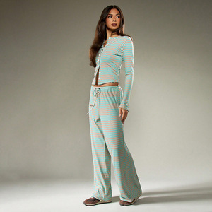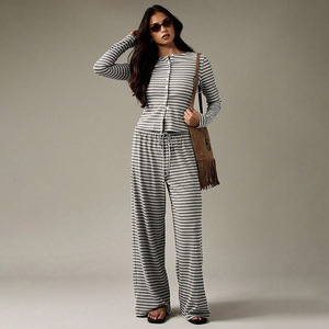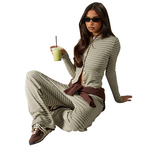 2025外贸跨境秋季女装新款条纹单排扣长袖抽绳长裤两件套装