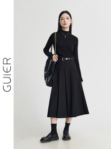 「GUIER」百褶半身裙长款女2025新款春季学院风高腰显瘦黑色a字裙