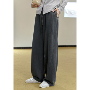 1313慵懒风松弛垂阔碳灰色破缝弯刀造型休闲裤女早秋抽绳直筒长裤