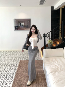 2025实拍纯欲短款吊带上衣长袖开衫套装高腰包臀半身裙条纹三件套