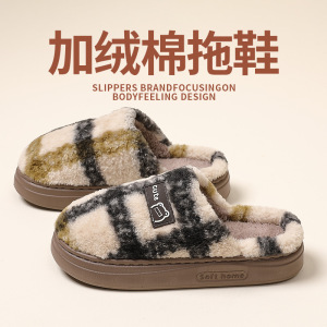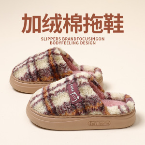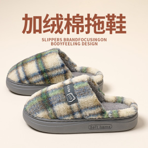 复古格纹棉鞋女秋冬季家居毛绒保暖外穿防滑韩版包跟棉拖鞋男批发