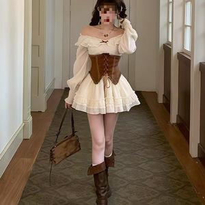2025秋季新款纯欲辣妹复古一字肩收腰长袖连衣裙+腰封两件套装女