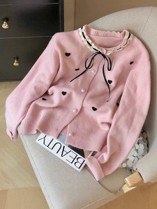 爱心蕾丝圆领系带蝴蝶结针织开衫女2025秋冬新款宽松温柔毛衣外套