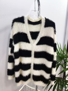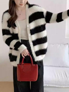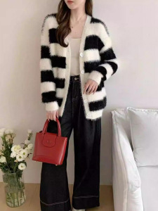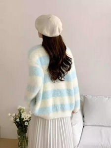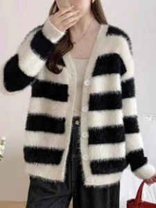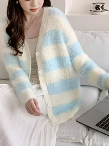 2025秋冬新款撞色条纹针织开衫女宽松百搭显瘦仿水貂绒毛衣外套潮