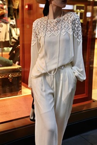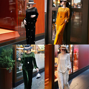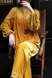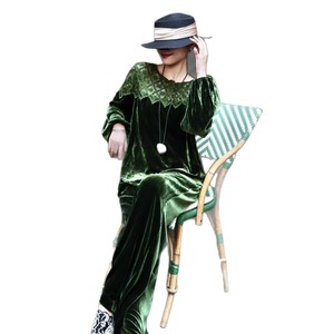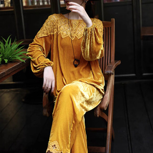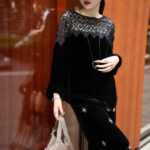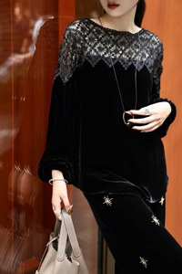 南油代发2025秋款圆领镂空花边拼真丝丝绒上衣法式气质衬衫灯笼袖