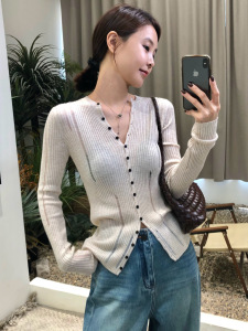 韩系设计感单排扣长袖针织衫女2025秋季新款镂空修身显瘦打底上衣