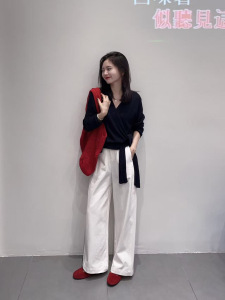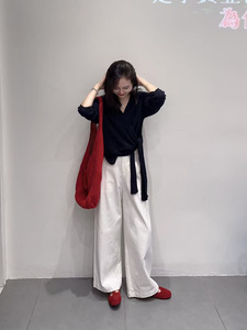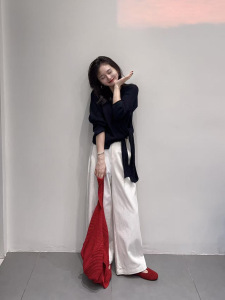 2025秋季新款韩版气质显瘦收腰绑带黑色针织上衣百搭阔腿裤两件套
