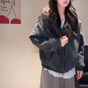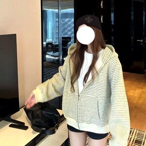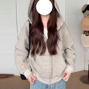 ins网红复古韩系秋冬新款宽松拉链连帽条纹休闲外套上衣潮流