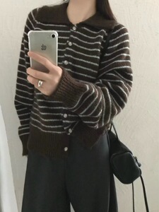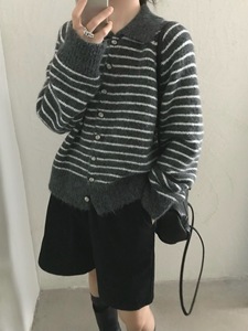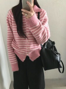 韩系减龄条纹翻领毛衣外套女宽松春秋冬加厚短款软糯针织开衫外穿