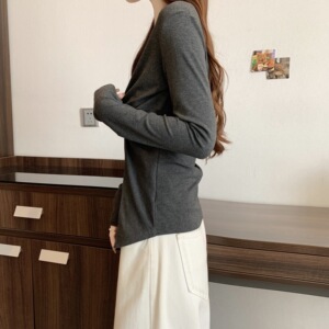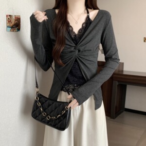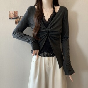 大码设计感纯欲风蕾丝挂脖扭结T恤真两件套修身显瘦长袖上衣女秋
