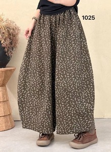 数码印花双层纱阔腿裤女2025秋新款松紧腰复古宽松大码长裤 1025