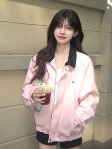 甜美风粉色翻领休闲夹克上衣女早秋小众设计感宽松美式棒球服外套