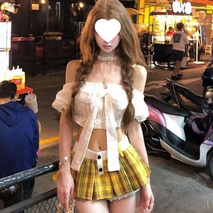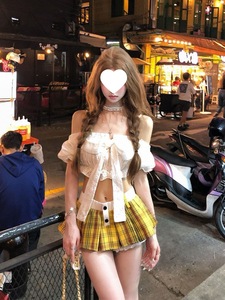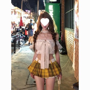 套装女夏季纯欲新款甜辣蝴蝶结短款抹胸上衣+复古格子百褶半身裙
