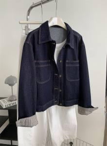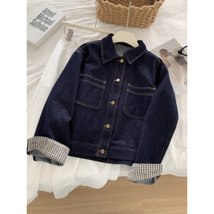 重磅复古水洗蓝格子袖牛仔外套女宽松韩版小个子翻领短款上衣秋季