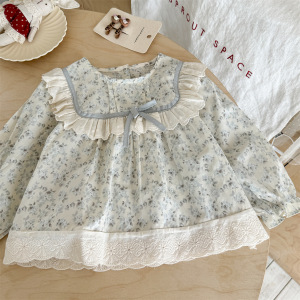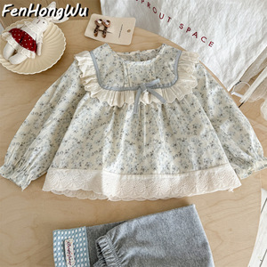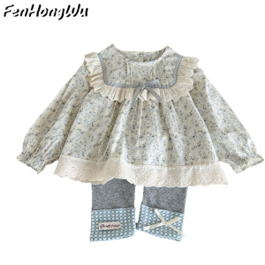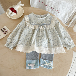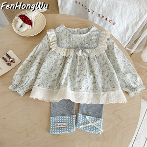 【粉红屋】女宝套装春秋季儿童洋气荷叶边长袖碎花衬衫打底裤跨境