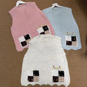 秋季新款森系温柔少女感无袖背心韩系甜美圆领拼接花边口袋马甲女