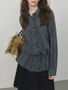 范思蓝恩复古慵懒木耳边泡泡格肌理衬衫女秋季2025新款衬衣3166