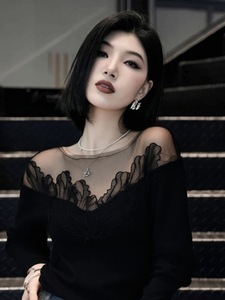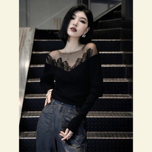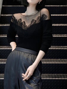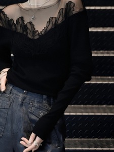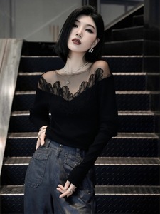 韩系早秋穿搭上衣小众不撞款气质高级感黑色网纱蕾丝拼接针织衫女