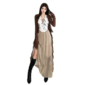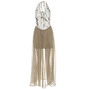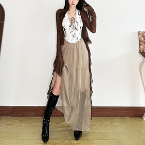 欧美夏季2025跨境新款纯色不规则长袖罩衫印花显瘦修身连衣裙套装